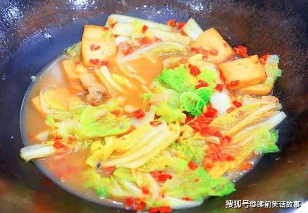 白菜炒软塌以后,沿锅边淋入适量的清水,倒入煎好的豆腐,加入食盐、胡椒粉、老抽,开大火烧开再转小火焖煮5分钟,然后转大火把汤汁收浓,再加入鸡精翻炒均匀就能出锅了,再加一点葱花点缀一下,色香味俱全的白菜炖豆腐就做好了。