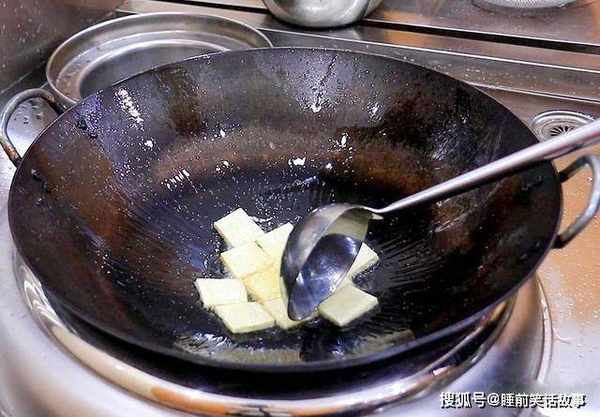 热锅凉油,在锅底均匀撒上食盐,然后放入豆腐用小火慢煎,要经常晃动锅豆腐才能均匀受热,一面煎黄以后翻过来煎另一面,煎至两面金黄即可倒出控油。