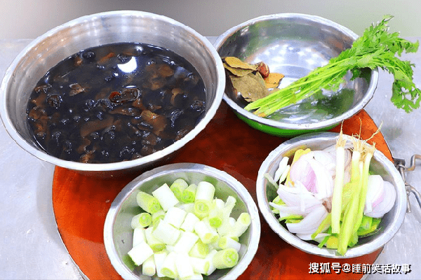 1.把木耳用凉水浸泡三个小时以上,泡好以后清洗干净;几根大葱,把葱白切成段,葱叶破开也切成段;再切点姜片、洋葱、小葱头、香菜;另外准备几片香叶、一个拍散的草果。