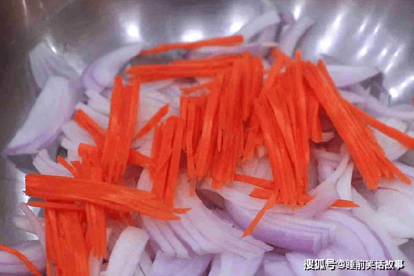 准备洗净的小洋葱三个,切成细丝,胡萝卜半根,也切成细丝,放在同一个盆中。