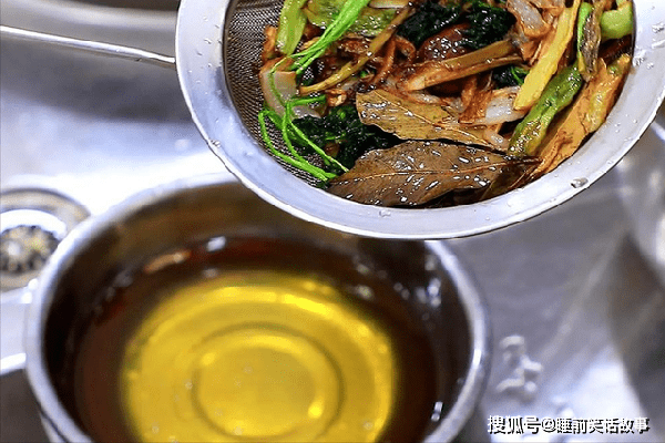 2.锅内烧油,油温5成热时把香叶、草果、小葱头、葱、姜、洋葱一起放入锅中,开小火慢慢炸,洋葱炸至微微变黄时放入香菜继续炸,把蔬菜中的油脂和香味炸出来,炸干炸成金黄色时立即关火,利用余温再浸泡一会儿,充分提取里面的葱油,把料渣沥出来,金黄鲜香的葱油就炸好了。
