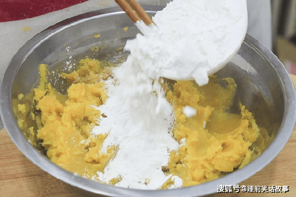 准备红薯一块,把红薯切成片,把水烧开,上锅蒸熟,切得稍微薄一点,蒸的时候节省时间,红薯蒸熟以后取出放在盆中,用勺子按压成红薯泥,加入糯米粉50克,用手团成红薯团。