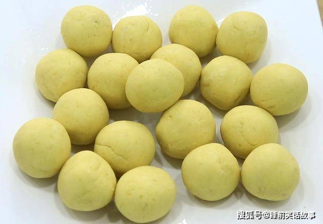 和好以后,用手揪下一个小面剂子,用手心揉成小圆球,揉成大小均匀的小圆球以后,全部放在盘中。