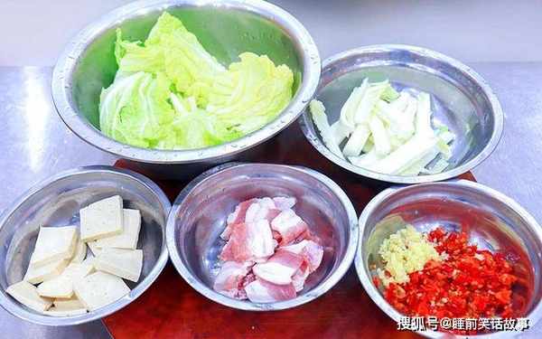 准备一块老豆腐清洗干净,然后切成片备用;一个白菜去除根部,把叶片一片一片掰下来,再把白菜叶切成大块,白菜帮切成宽条,分别用清水洗干净;一块五花肉去皮切成片;再准备剁椒酱30克,切少许姜末放在一起备用。