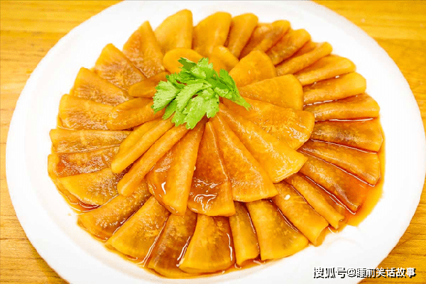然后一块往萝卜片上一倒,注意料汁的量尽量没过萝卜片。用保鲜膜封住,密封腌制三个小时就可以吃了。