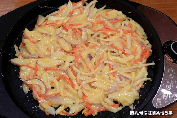 馅料准备好以后,我们开始烙制,电饼铛预热三分钟,均匀刷上植物油,把馅料倒入锅中,摊成薄厚均匀的圆形面饼,盖上锅盖烙3分钟,让饼内部更快成熟。