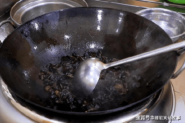 3.锅内留底油,倒入木耳煸炒一会儿,把里面的水分炒出来,听到有噼啪的声音就可以了,加入生抽5克,淋入一点清水,胡椒粉2克,蚝油3克翻炒化开调料,再淋入少许葱油增香提色,翻匀以后盛出来备用。