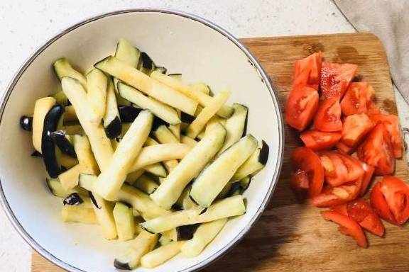 1、圆茄子洗净后,切成手指粗细的条状,2个小西红柿切成小块儿;