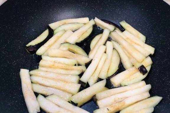 3、锅中放入适量油,把处理好的茄子放入锅中中小火煎制,茄子变成微微的金黄色,能闻到焦香味就可以盛出啦;
