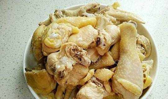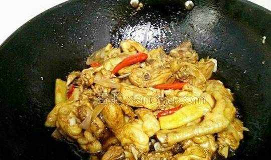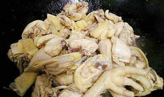 5.锅里放适量油,倒入鸡块炒干水份、变微黄。