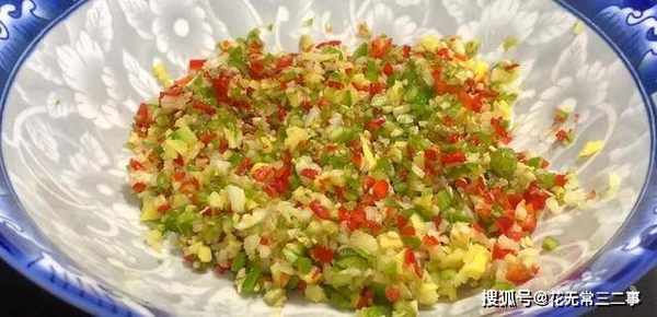 4.青红椒、大蒜、生姜剁成碎末,装入碗中,搅匀。