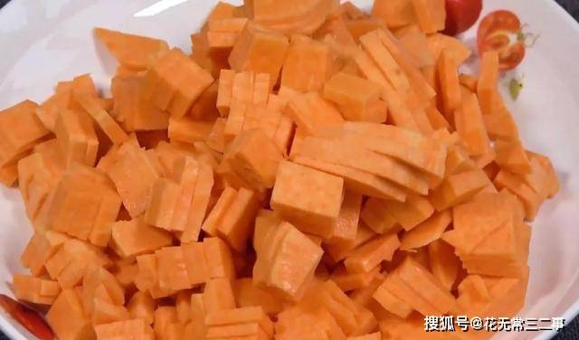 2.红薯洗净后,削去外皮,先切薄片,再切条,最后切丁,装盘备用。