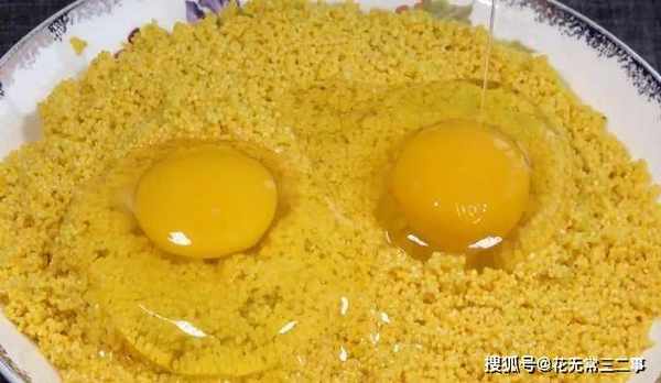 3.小米控水捞出,装入盘中,打2颗鸡蛋,搅匀。