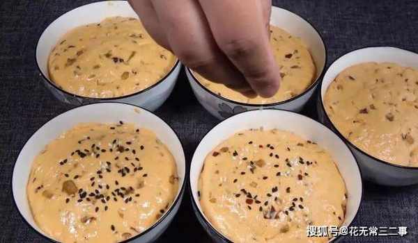 10.倒入面糊,装7分满即可,整理平整,再撒一些黑芝麻点缀。