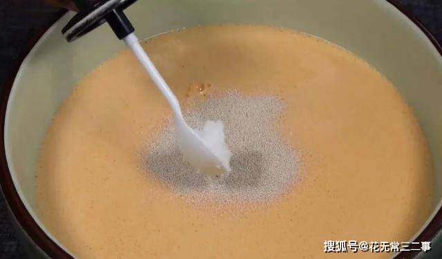5.打好打入碗中,加5克酵母粉,一勺白糖,搅匀。