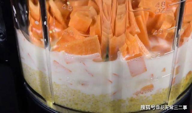4.倒入料理机,再放入切好的红薯丁,150毫升纯牛奶,启动机器打成米糊。
