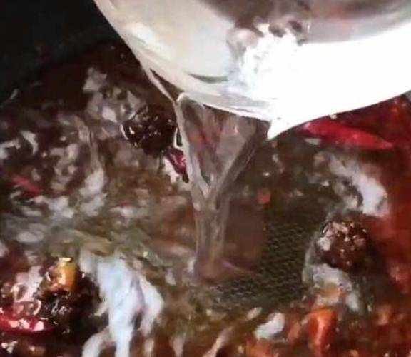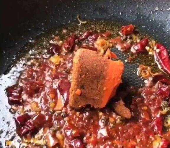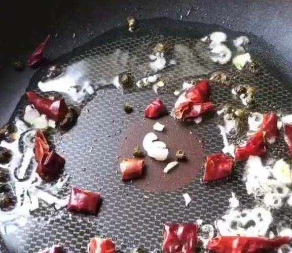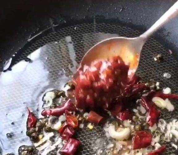 再往唤中加入干辣椒、花椒、葱给炒香。