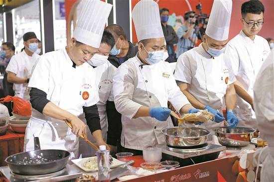 在烹饪区,方便快捷的预制菜让大厨们比往时参加厨艺大赛轻松多了,只需带上几包预制菜就可以上场了。就像一款“羊肚菌花胶”,深圳市谭和鲁食品研发有限公司的大厨只带了10套底加热的瓷碗,拆开预制菜包装,倒进羊肚菌和花胶,然后在旁边的一口大锅拆开高汤料包,慢慢加热,鲜浓的汤底瞬间弥漫在比赛现场,汤好了之后再倒入瓷碗中,就还原出色香味齐全的一款大厨靓汤,厨房小白在家也能轻易操作。