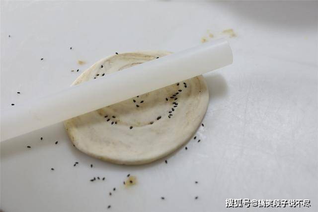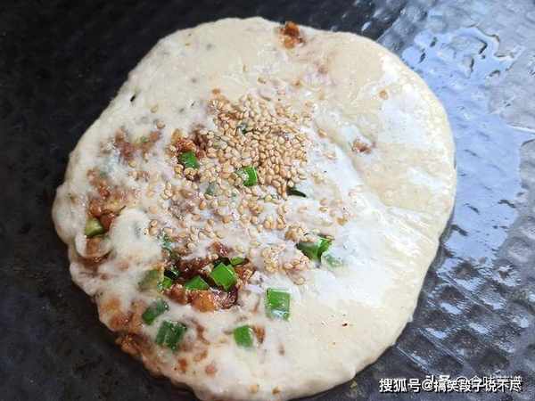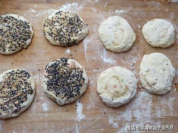 7、中间放少许黑芝麻,擀成饼胚,不需要擀太薄哈,直径大概8厘米就像,建议烤着吃,那样才美味。