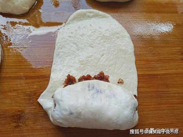 第七步:肉馅别舀入太多,留出头部位置,从下往上卷起来,再把两头捏合好。