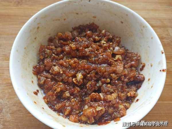 第五步:炒匀后的酱汁,倒入到肉馅儿中,再倒入适量老抽增色,朝着一个方向,搅拌1分钟,让肉馅上劲,这样吃起来更筋道。