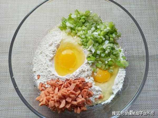 3、准备260克面粉,装入碗中,倒入切好的葱花、盐、火腿肠,再打入2个鸡蛋,用筷子从一边开始,边倒入温水边搅拌。