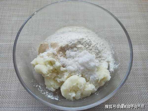 4、等待温度降至温热,倒入大点的碗中,加入500克面粉,5克酵母,30克白糖,不吃甜的可不放,倒入适量的温水,边倒边搅拌。