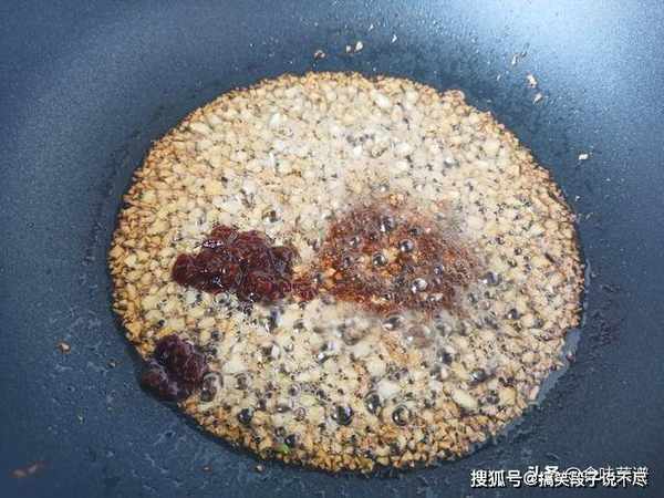 第四步:接下来倒入蒜末,煸炒出香味,全程保持小火,加入1勺酱油,1勺黄豆酱,适量五香粉和胡椒粉,快速滑炒均匀。