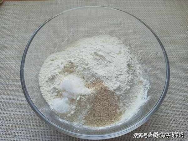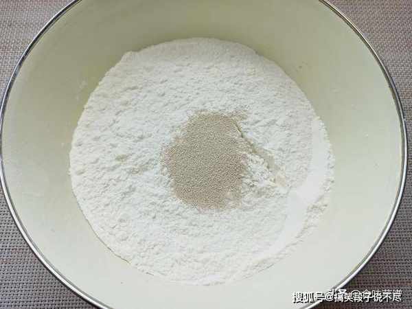 第一步:碗中加入400克普通面粉,加入4克酵母,5克白糖,白糖可促进发酵,先用筷子混合搅匀。