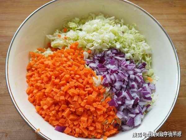 1、一根胡萝卜、半个洋葱,先切片再切成碎末,洗净的白菜,也切成碎末,装入碗中备用,如果家中有料理机的,一分钟即可搞定。