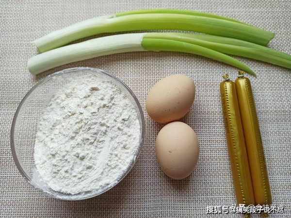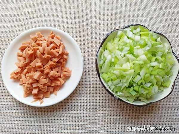 2、取出火腿肠,剥去外衣,先切成细丝,再切成碎末,大葱一根,切成葱花。