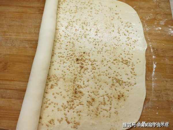 4、用擀面杖擀成0.5厘米,长方形的大面皮,擀的时候,先从中间开始,往四周慢慢地擀,发力要均匀,表面刷上一层食用油,撒上一层椒盐,再撒一层熟芝麻。