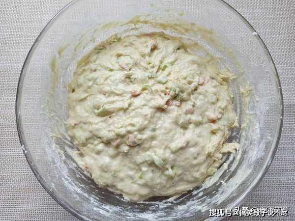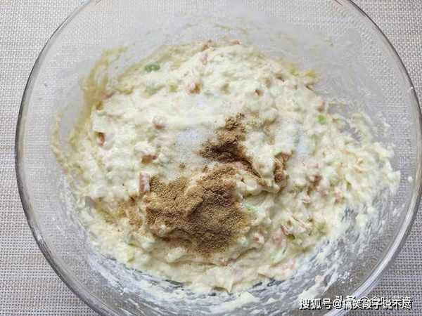 4、添加适量面粉,少量多次,边倒边搅拌,蛋液和蔬菜中本身有水分,无需添加一滴水。