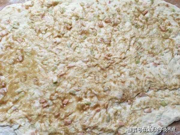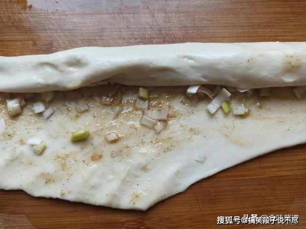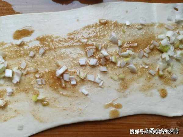 5、把分好的面剂,用擀面杖擀开,薄一点最好,均匀地抹上油酥,撒上葱花。