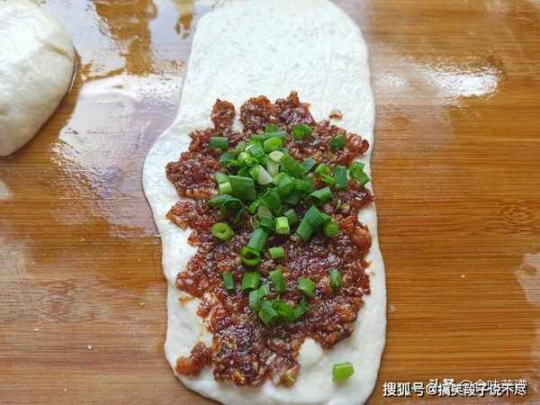 第六步:发酵好的面团,用筷子搅一搅排出空气,为了防止粘连,要在案板上抹一些油,把面团整理成长条,分成均等的面剂,把剂子擀成长条形,舀入肉馅,放上葱花。