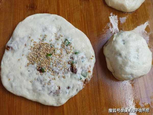 第八步:然后团成一个圆形,再上面撒一层白芝麻,从中间向外轻轻按成圆形,正反面都要按一下,使饼皮薄厚均匀。