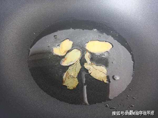 第三步:锅中倒入植物油,放入姜片和香叶,我们只取它的香味,小火炸出香味后,便可捞出扔掉。