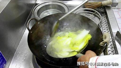 3.锅里加水,加入食盐,植物油,加入植物油是为了菜色更加鲜亮,水烧开后,倒入娃娃菜,焯水30秒钟,捞出控干水分。