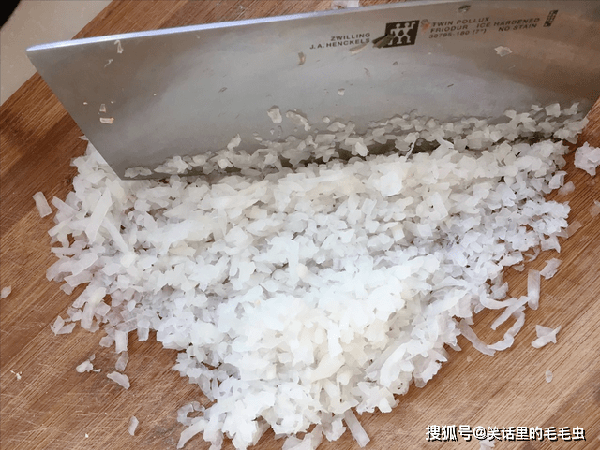 4、把攥干的萝卜丝,放在案板上,用锋利的快刀剁一剁,剁成碎馅。