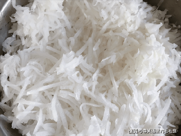 2、白萝卜控干水分以后,用擦丝器斜着擦成细丝,越长越好,舀入一勺食盐,搅拌均匀,腌制十五分钟,等时间到了,装入一块干净的滤布中,攥掉多余的水分。