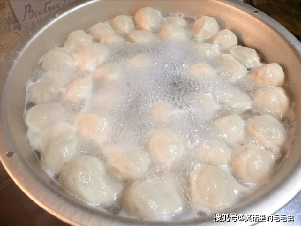 7、起锅烧水,水开下入饺子,重复点入三次凉水,等饺子全部上浮,变得圆滚滚的,表示就已经熟了,捞出控水,准备开吃。