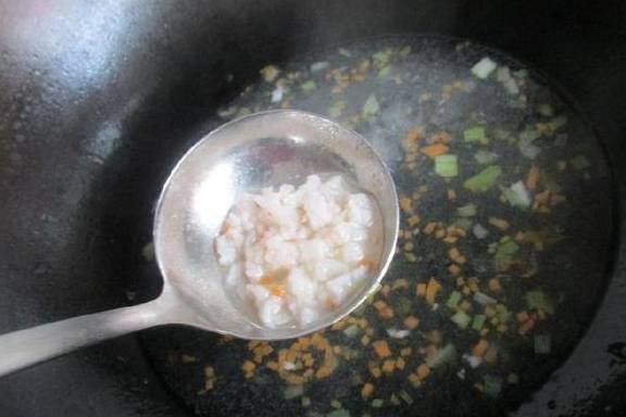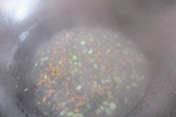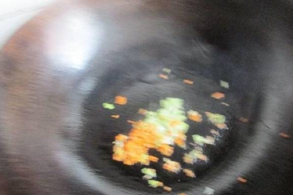 7,锅里加入一点花生油,下入葱末和胡萝卜炒香。