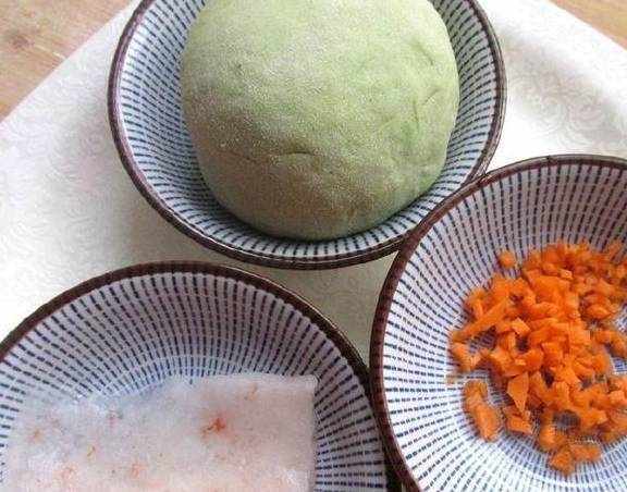 1,把油菜打成汁和面粉一起和成面团,南极磷虾解冻,胡萝卜切末。