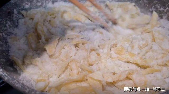 10、连续翻炒五六分钟之后,就会发现糖浆慢慢结晶,变成白色细砂糖,粘在姜片表面。