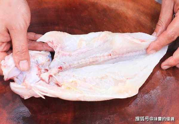 1.准备一条新鲜的鲈鱼,已经宰杀干净了,先沿着脊背把两侧划开,因为背部的肉比较厚,这样处理更容易蒸熟,再从腹部片开让鱼能够展开。