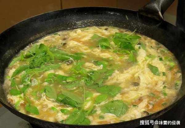6.这个时候撒入葱花,淋上蛋液,蛋穗全部飘起来以后,放入荆菜叶,淋上芝麻香油,这道清香营养的山药疙瘩汤就做好了。