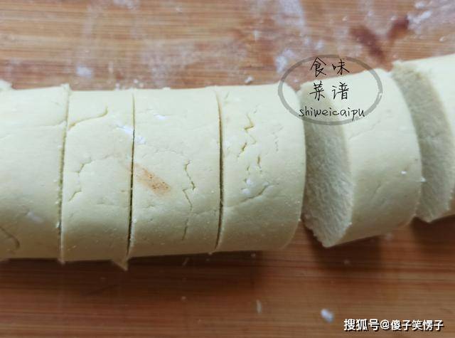 4、揉好的面团,搓成一根长条,直径5厘米左右,然后分成2厘米宽的面剂子,用掌心按压扁。