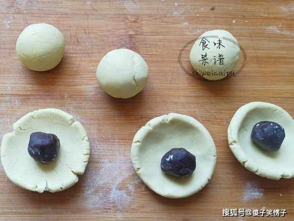 5、将豆沙馅放进面剂中,用虎口慢慢,慢慢团成一个圆形,尽量多团一会,保证不露馅的同时,看起来也美观。
