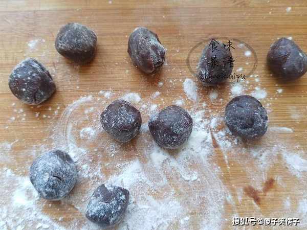 3、我用的是豆沙馅,也可根据口味选择其他馅料,先撒点干面粉,让它不至于太粘,然后将豆沙团成球状,如图所示。