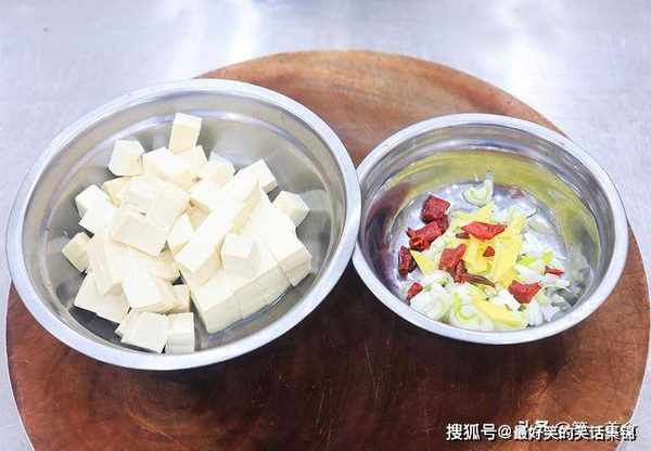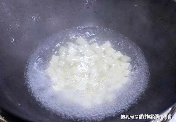 2.豆腐焯一下水:锅内烧水,水烧开以后把豆腐放入锅中,大约煮2分钟把豆腐倒出来,用清水冲洗几下控水备用。